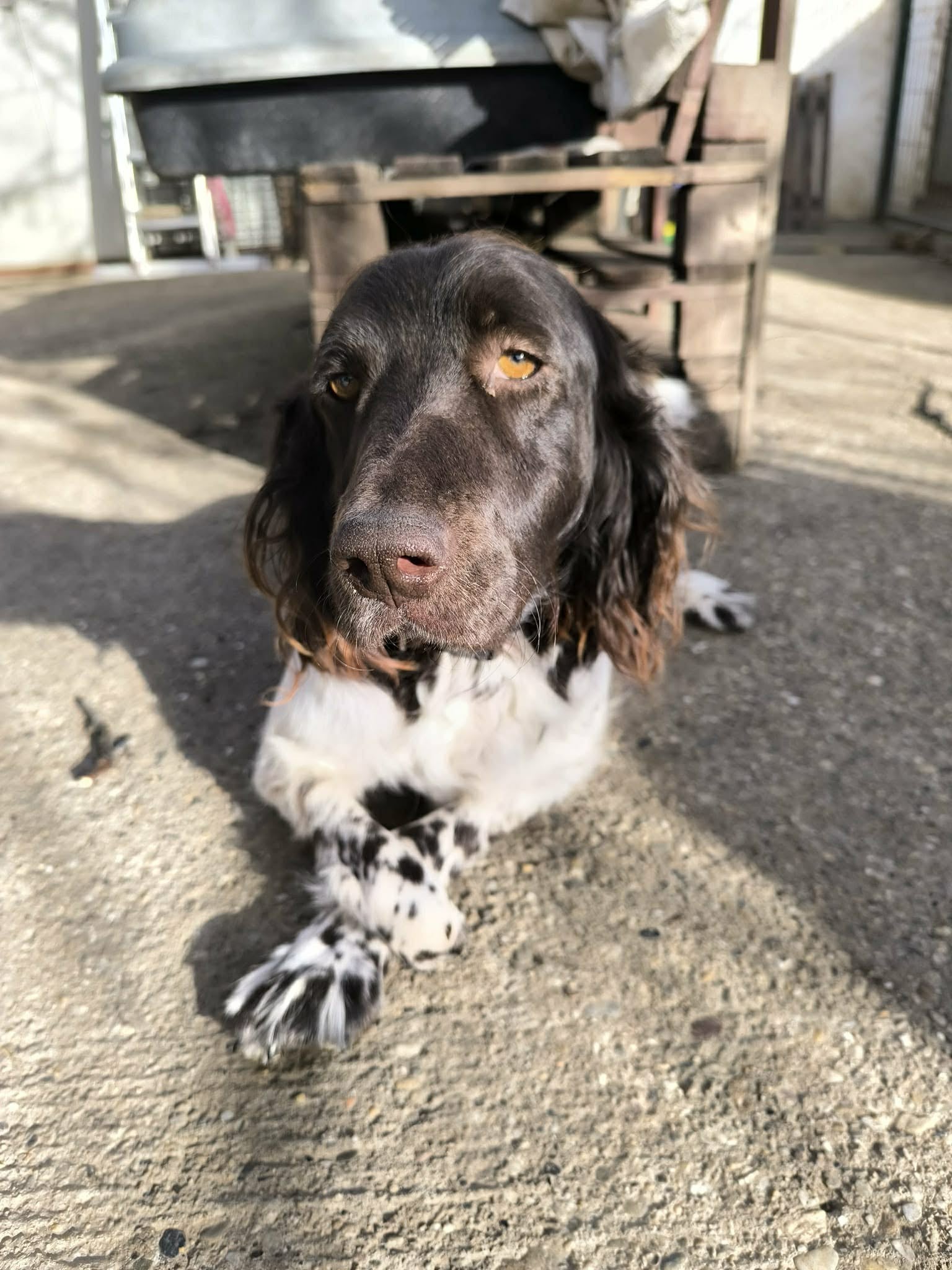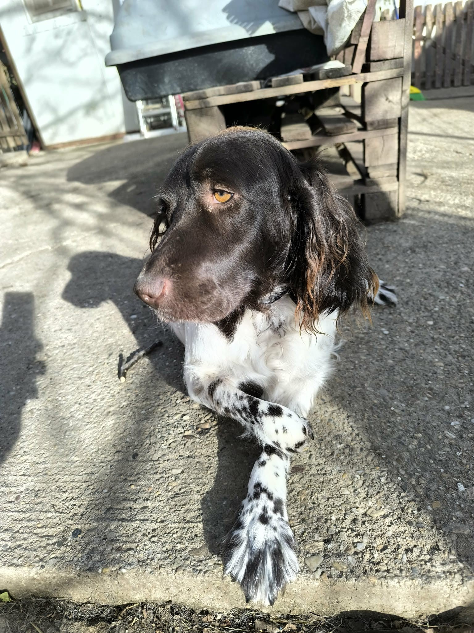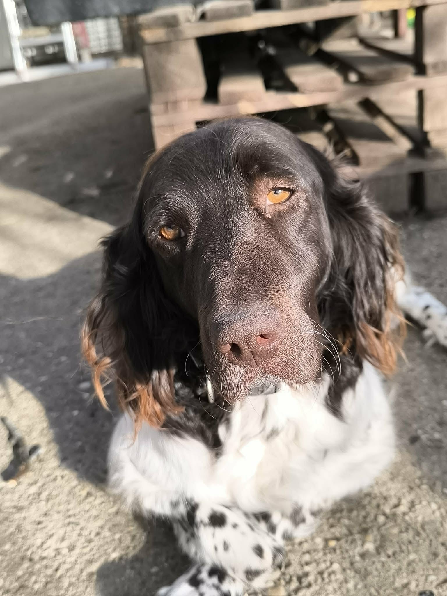 She is a healthy Small Munsterlander around 3/4 years old. She just appeared in a town centre as is. 2 legs missing. We were astonished. It appears to be an old injury.
